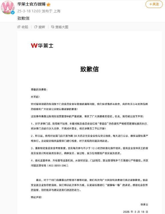 华莱士被曝食品安全问题网上配资平台开户,官方回应:涉事门店永久关停,开除涉事员工华莱士被曝食品安全问题,官方回应:涉事门店永久关停,开除涉事员工