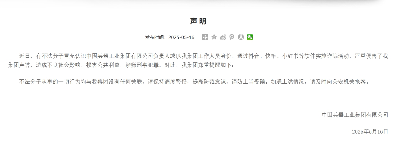 兵器工业集团声明:不法分子从事的一切行为均与我集团没有任何关联兵器工业集团声明:不法分子从事的一切行为均与我集团没有任何关联