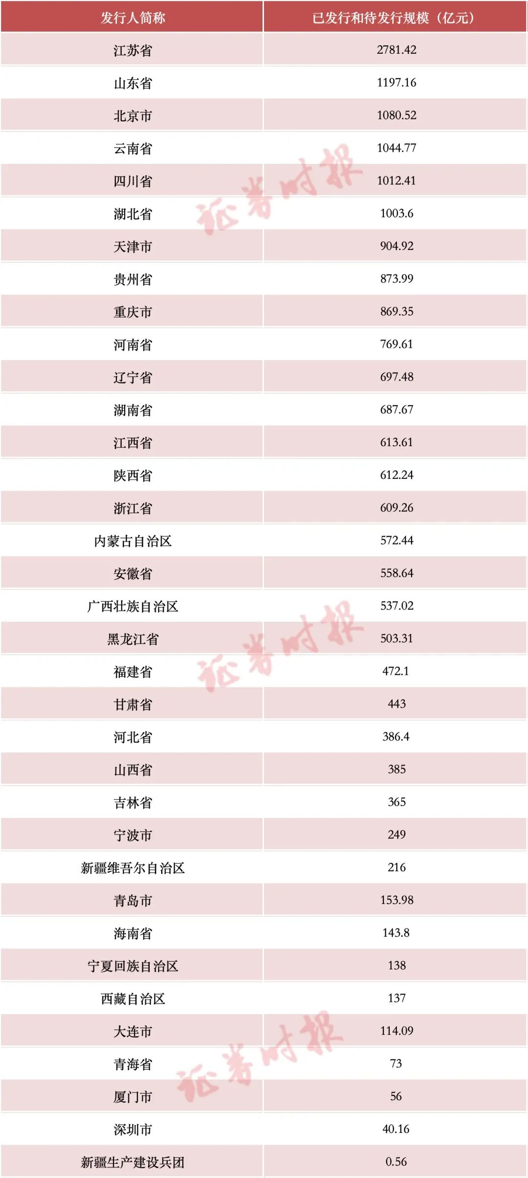 具体来看,江苏省以2781.42亿元的发行规模,位居第一;山东省、北京市、云南省、四川省、湖北省等地的发行规模均超过1000亿元;天津市的发行规模超过900亿元,贵州省、重庆市的发行规模超过800亿元,河南省的发行规模也在700亿元以上;此外,辽宁省、湖南省、江西省、陕西省、浙江省等多个地方政府的发债规模超过600亿元。