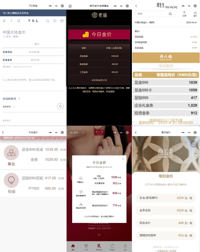 再创新高 多家黄金珠宝品牌首饰金价逼近1040元/克再创新高 多家黄金珠宝品牌首饰金价逼近1040元/克